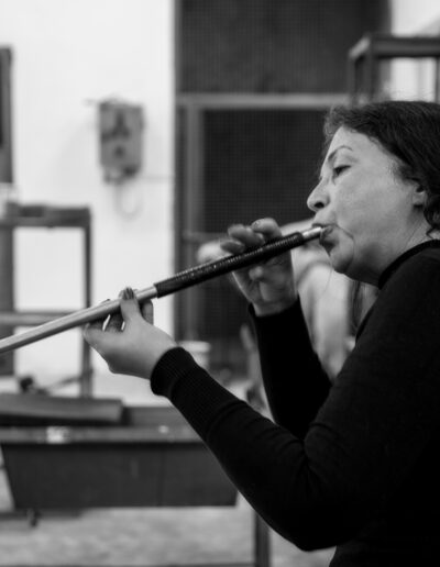 Dieses Jahr freuen wir uns, die tunesische Künstlerin Sadika Keskes im Atelier des Museums begrüssen zu dürfen. Während ihres Aufenthalts im Vitromusée Romont, vom 27. März bis zum 5. April 2026, wird sie ein Glasgemälde mit dem Titel Abstraktion im Format 50 x 100 cm blasen, in einer von ihr entwickelten innovativen Technik, die heisses Glas und Metall miteinander verbindet. Die Besucher·innen können so die verschiedenen Schritte des Entstehungsprozesses mitverfolgen und sich mit der Künstlerin über diese technische und künstlerische Innovation austauschen. Am Wochenende vom 28. und 29. März finden Vorführungen statt, bei denen die Künstlerin mit derselben Technik zwei Vasen herstellen wird. Dies bietet die Gelegenheit, die Arbeit mit geschmolzenem Glas und die Handgriffe der Künstlerin zu beobachten.