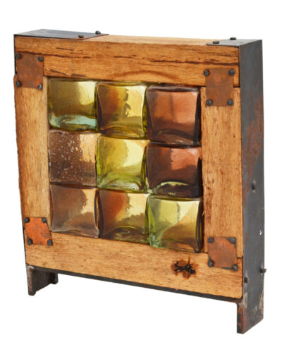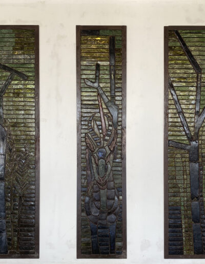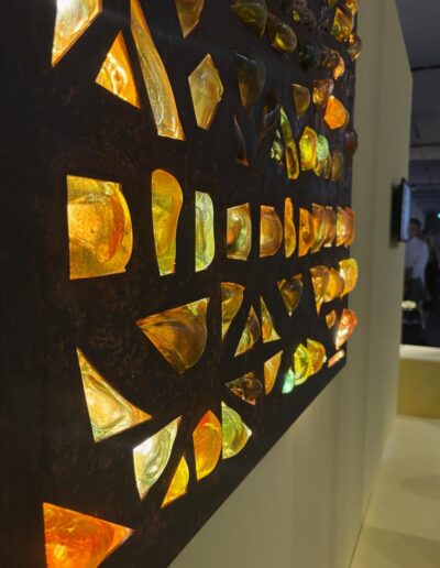 Ihre aktuellen Recherchen im Bereich der Glasmalerei streben an, das traditionsreiche Medium durch die Neubetrachtung ihrer technischen und gestalterischen Prinzipien zu erneuern. Ihre Glasmalerei besteht aus vollständig von der Künstlerin geblasenem Glas, das nicht etwa, wie üblich, durch Blei verbunden wird, sondern das von hitzebeständigem Metall wie Stahl oder Edelstahl getragen wird. Diese Materialien bieten nicht nur eine mit Blei vergleichbare Struktur, sie sind auch robuster und bringen neue formale Möglichkeiten mit sich. Während bei der klassischen Glasmalerei farbige Glasstücke geschnitten und anschliessend in Blei gefasst und durch Löten zusammengefügt werden, kehrt der Ansatz von Sadika Keskes diesen Prozess um. Zunächst entwirft die Künstlerin eine hitzebeständige, mit Öffnungen versehene Metallplatte. Diese Hohlräume nehmen dann das geschmolzene Glas, welches hineingeblasen wird, auf. Das Glas ist somit keine flache, zugeschnittene Oberfläche mehr, sondern ein bewegliches Material, das direkt in der Metallstruktur Gestalt annimmt. Je nach plastischen Erfordernissen und nach Lichtbedürfnissen gestaltet die Künstlerin jedes Stück Glas auf seine Art, ob zu einem leicht gewölbten Volumen oder zu einer regelmässigen Fläche. Dieser Ansatz ermöglicht es ihr, eine organischere Beziehung zwischen Glas, Licht und Farbe zu erforschen. Die Bearbeitung von heissem Glas ermöglicht Farbmischungen, Nuancen und Lichtschimmer, die mit traditionellen Verfahren nicht zu erzielen sind. Jedes geblasene Element wird so zu einer einzigartigen Form, die vom Licht durchdrungen und durch die inneren Bewegungen des Materials belebt wird.